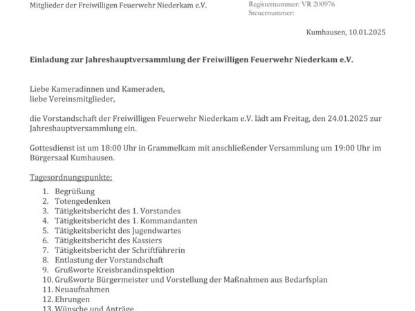 Die Vorstandschaft der Freiwilligen Feuerwehr Niederkam e.V. lädt alle aktiven und passiven Mitglieder für Freitag, 24.01.2025 zur Jahreshauptversammlung ein